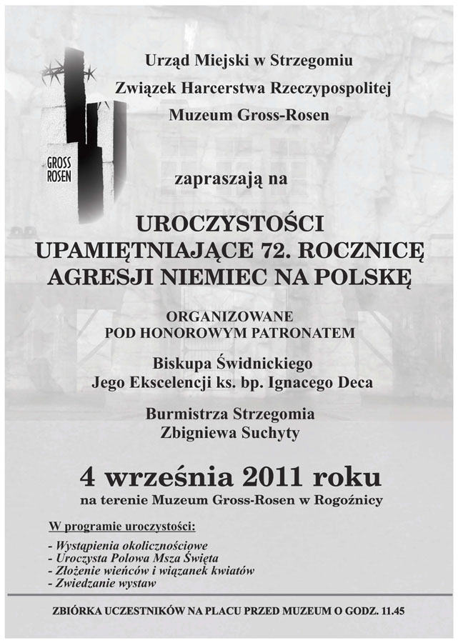 Dorocznym zwyczajem na terenie byłego hitlerowskiego obozu koncentracyjnego Gross-Rosen odbędzie się 4 września 2011 r. uroczystość upamiętniająca 72. rocznicę wybuchu drugiej wojny światowej. Do Muzeum w Rogoźnicy zapraszamy zainteresowanych udziałem w obchodach, których celem jest uczczenie pamięci ofiar tego obozu i poległych w czasie działań wojennych. Szczególnie serdecznie zapraszamy byłych więźniów obozu Gross-Rosen i ich rodziny.
